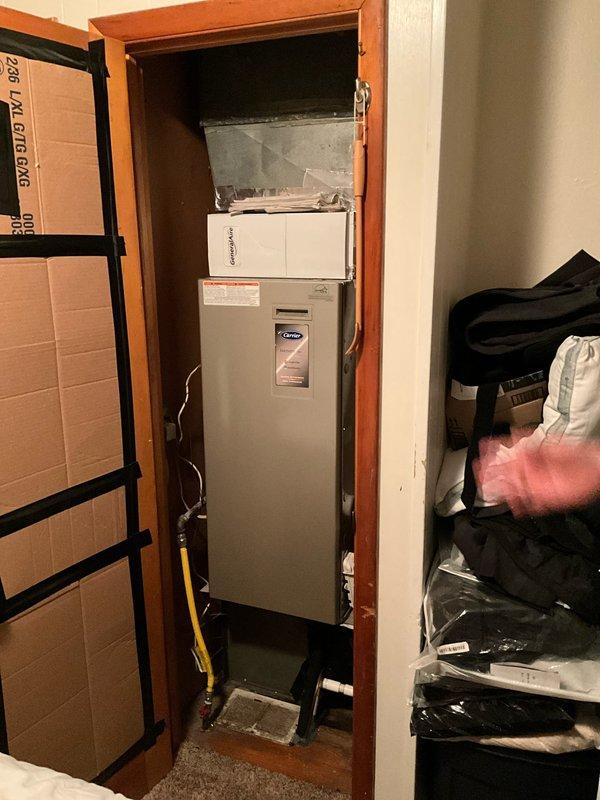 Responded to service call for failed blower motor on 2006 furnace with 4-year-old air conditioning system. Conducted comprehensive system evaluation of existing Carrier air handler unit installed in interior mechanical closet. Assessed equipment condition, operational status, and replacement options due to age of heating system and blower failure. Provided complete system replacement estimate for new HVAC equipment to address immediate heating needs and ensure reliable long-term operation.