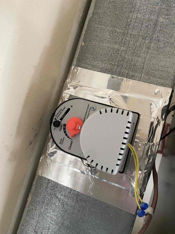 Completed system start-up procedures for new HVAC installation. Successfully installed and secured thermostat/damper control device to duct system using metallic foil tape, with proper wiring connections established and verified for operational functionality.