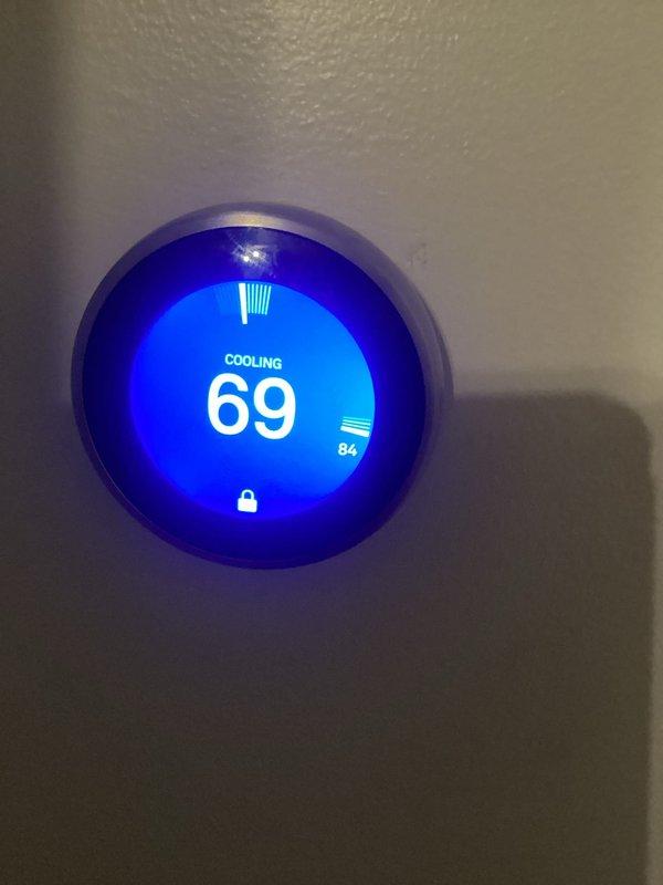 Completed routine HVAC maintenance on aging cooling system over 10 years old. Verified thermostat operation and confirmed system cycling properly with unit maintaining set point of 69°F against ambient temperature of 84°F. All components inspected and system operating within normal parameters.