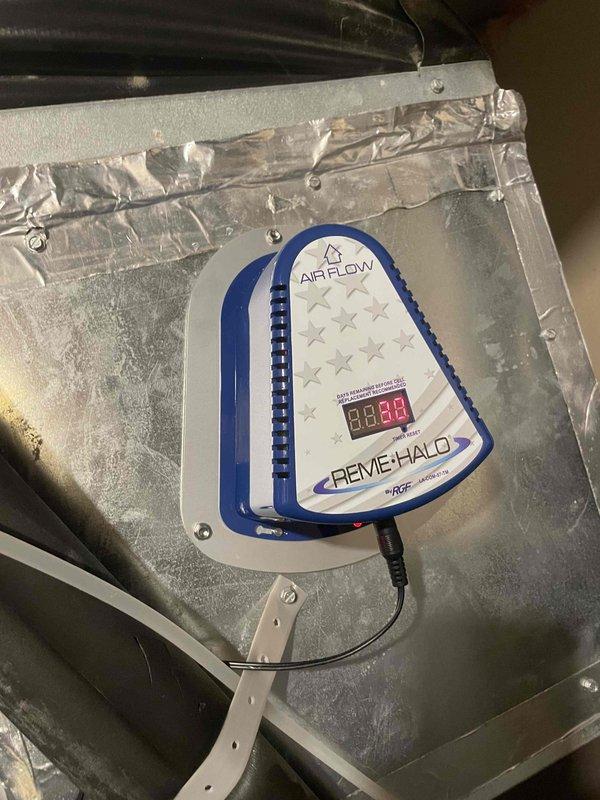 Completed comprehensive duct cleaning service with Superior, including blower and coil cleaning. Successfully installed and verified REME HALO air purification system, confirming proper airflow measurement of 0.88 on the digital monitor.