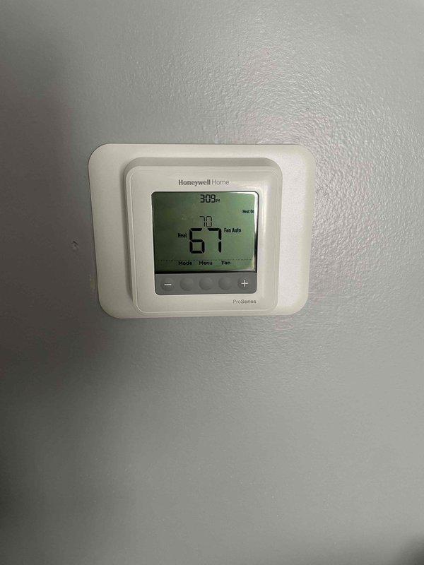 Responded to no heat complaint at residential property. Diagnosed issue with Honeywell ProSeries thermostat showing 64°F in heat mode. Performed system maintenance and restored proper heating operation.