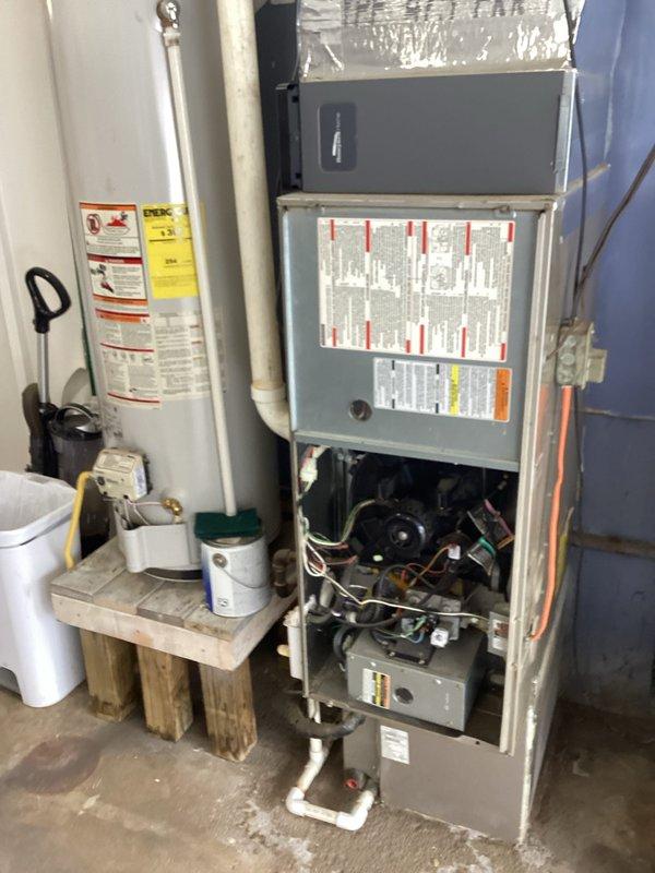 Diagnosed no heat complaint on gas furnace. Upon inspection, identified potential inducer fan failure preventing proper furnace operation. Opened access panel to examine internal components, wiring, and control board for further troubleshooting. Recommended inducer fan replacement to restore heating functionality.
