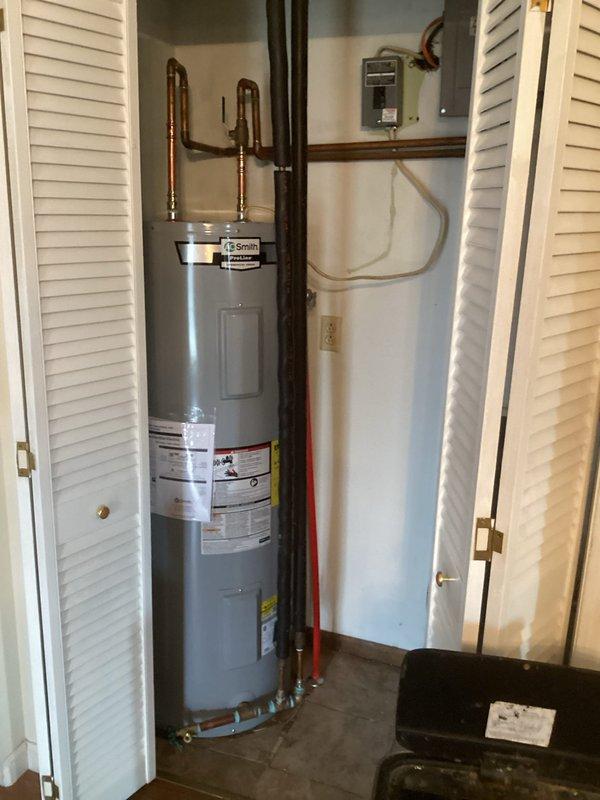 Successfully installed a new Supreme Lifetime electric water heater with EverKleen system in the utility closet. Connected copper supply lines, installed proper electrical connections, and ensured all fittings were secure with no leaks present upon final inspection.