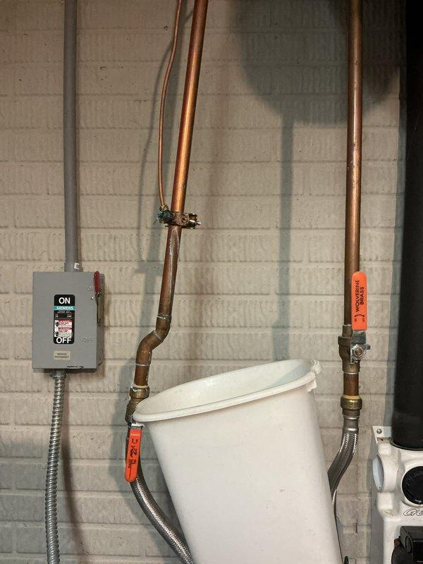Performed diagnostic assessment of reported T&P valve leak on customer's Everhot tanked water heater. Inspected copper piping connections and valve assembly at top of unit. No active leaks were detected at the temperature and pressure relief valve or surrounding fittings. System appears to be operating normally with proper installation of discharge tube.