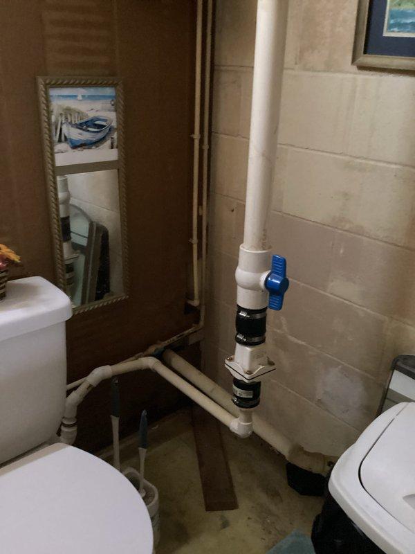 Completed prepaid plumbing maintenance inspection with focus on pipe assembly and toilet tank. Documented vertical pipe system with blue insulated section, copper connections, and red handle valve. Interior toilet tank inspection revealed aging components with mineral deposits, functioning fill valve with red cap, and standard mechanisms in working order.