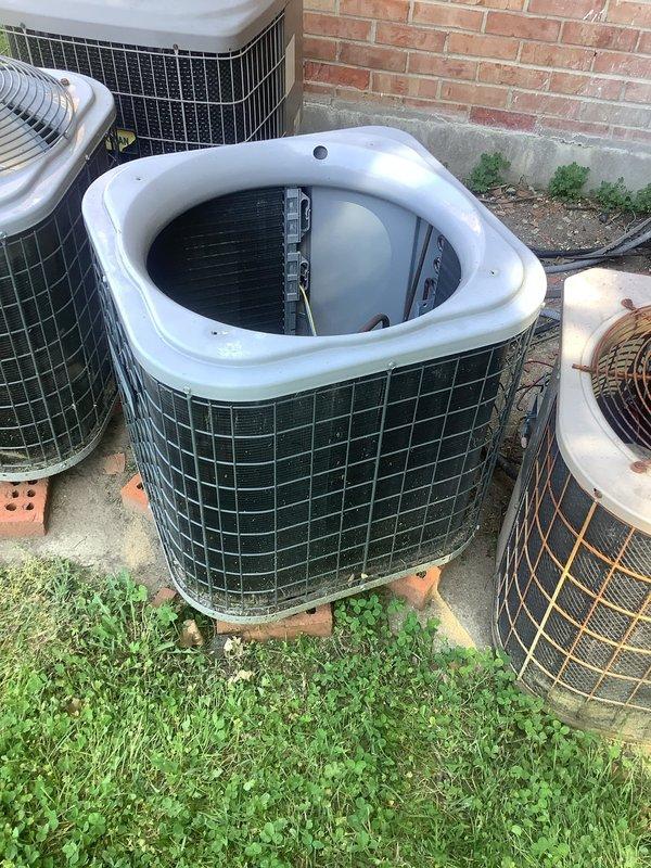Responded to service call for multiple non-operational outdoor A/C units. Upon arrival, inspected three condenser units and removed top grille from center unit to access internal components including fan blade and condenser coil for diagnostic evaluation of reported fan motor failures.