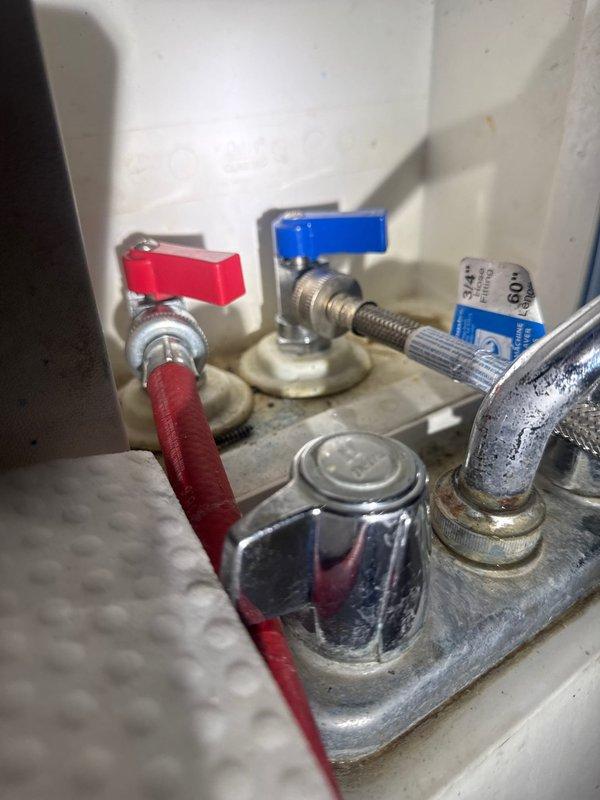 Responded to emergency water leak affecting warehouse wall adjacent to female restroom. Discovered deteriorated supply line connections with visible corrosion at valve assembly. Replaced damaged components and verified proper operation of both hot and cold water lines, successfully resolving the leak and preventing further water damage to baseboards and surrounding areas.