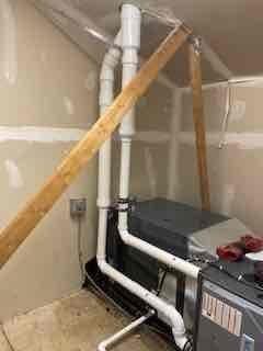 Returned to commercial site to address vent repair issue where system was cycling on and off with interior temperature at 60°F. Inspected HVAC system including furnace unit and associated PVC ventilation piping. Secured loose ventilation pipes with wooden braces to stabilize the installation and ensure proper system operation.